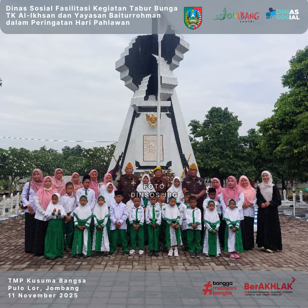 Jombang – Dalam rangka memperingati Hari Pahlawan yang jatuh pada tanggal 10 November 2025, Dinas Sosial Kabupaten Jombang memfasilitasi kegiatan tabur bunga yang diikuti oleh adik-adik dari TK Al-Ikhsan Sumobito dan Yayasan Baiturrohman Mojowarno. Kegiatan tersebut dilaksanakan pada Selasa, 11 November 2025, di Taman Makam Pahlawan (TMP) Kusuma Bangsa, Pulo Lor, Jombang.