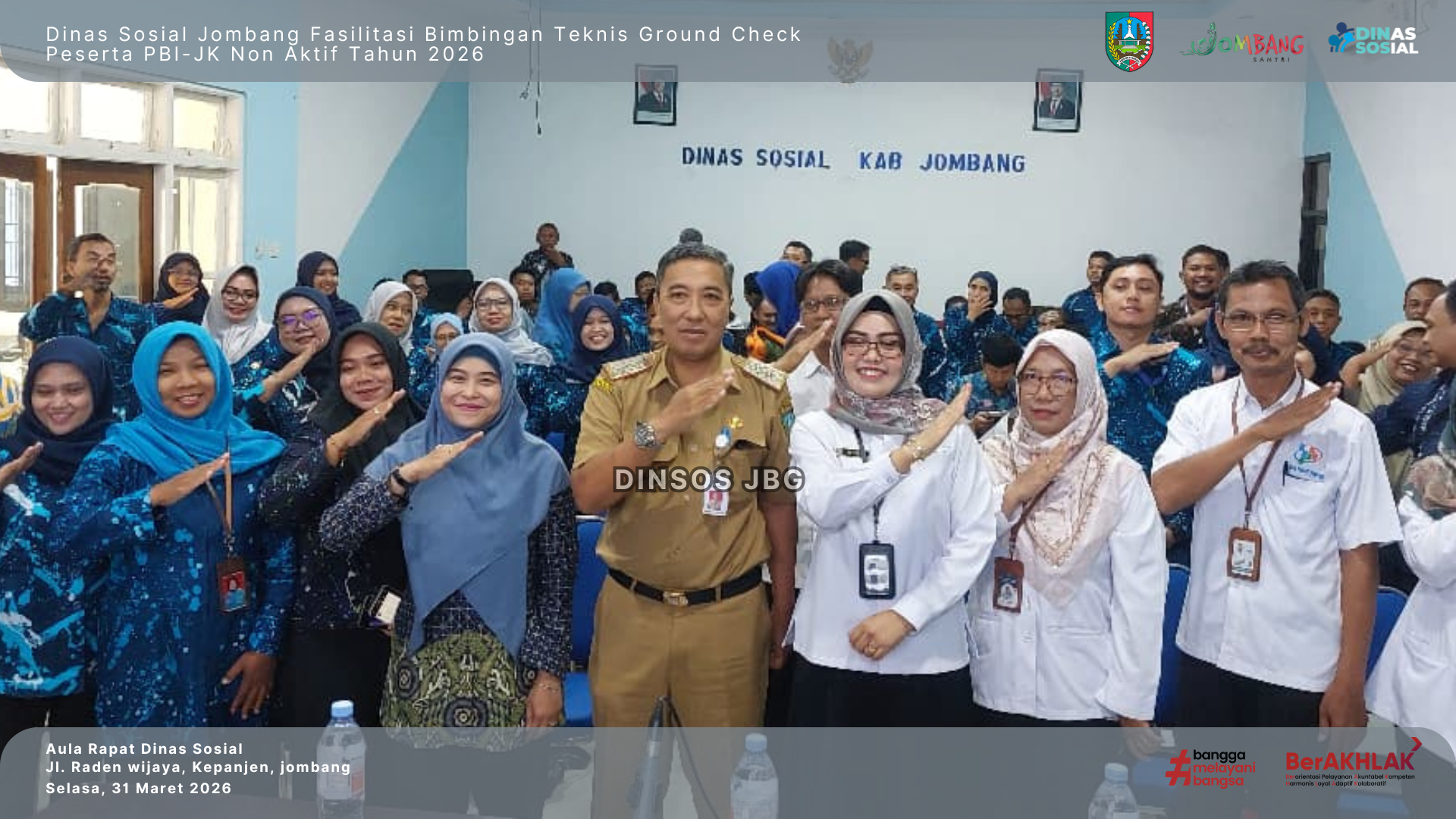 Dinas Sosial Kabupaten Jombang menyelenggarakan kegiatan bimbingan teknis (bimtek) ground check bagi peserta Penerima Bantuan Iuran Jaminan Kesehatan (PBI-JK) non aktif tahun 2026. Kegiatan ini dilaksanakan pada Selasa, 31 Maret 2026, bertempat di Aula Dinas Sosial Kabupaten Jombang.