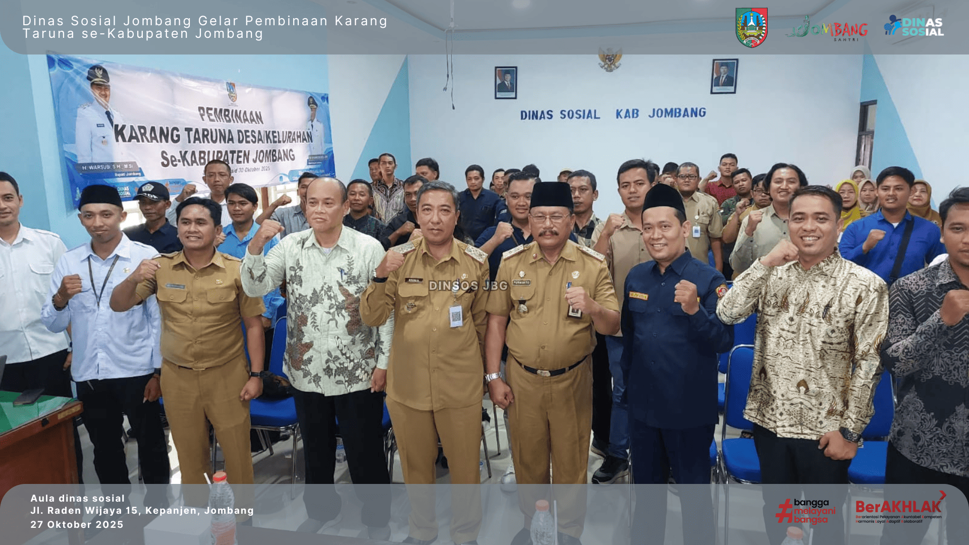 Dinas Sosial Kabupaten Jombang menggelar kegiatan Pembinaan Karang Taruna se-Kabupaten Jombang Tahun 2025. Kegiatan ini dilaksanakan selama empat hari, mulai 27 hingga 30 Oktober 2025, bertempat di Aula Dinas Sosial Kabupaten Jombang.