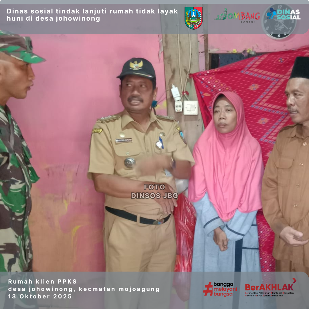 Dinas Sosial Kabupaten Jombang bersama Forkopimcam Mojoagung, Pemerintah Desa Johowinong, Babinsa, Bhabinkamtibmas, serta Tenaga Kesejahteraan Sosial Kecamatan (TKSK) Mojoagung melakukan penjangkauan terhadap salah satu warga Desa Johowinong, Kecamatan Mojoagung, setelah viral di media sosial terkait kondisi rumah tidak layak huni. (13 oktober 2025)