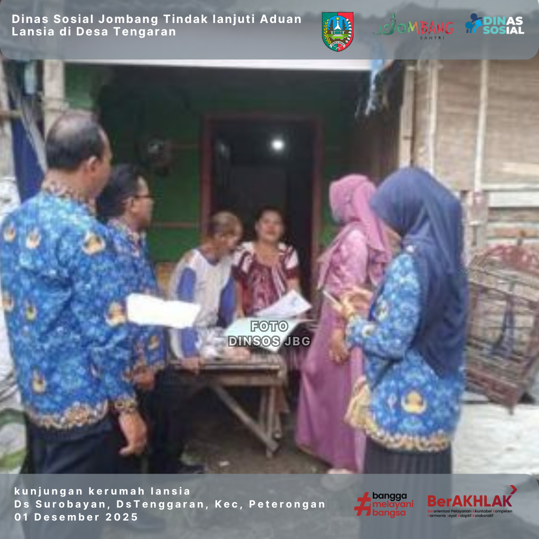Dinas Sosial Kabupaten Jombang bersama Tenaga Kesejahteraan Sosial Kecamatan (TKSK) dan SDM PKH Peterongan menindaklanjuti aduan masyarakat terkait seorang lansia yang dikabarkan tidak menerima bantuan sosial di Dusun Sorbayan, Desa Tengaran, Kecamatan Jombang. Penanganan dilakukan pada tanggal 1 Desember 2025.