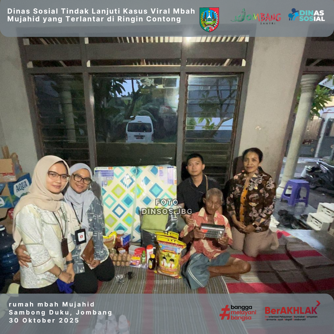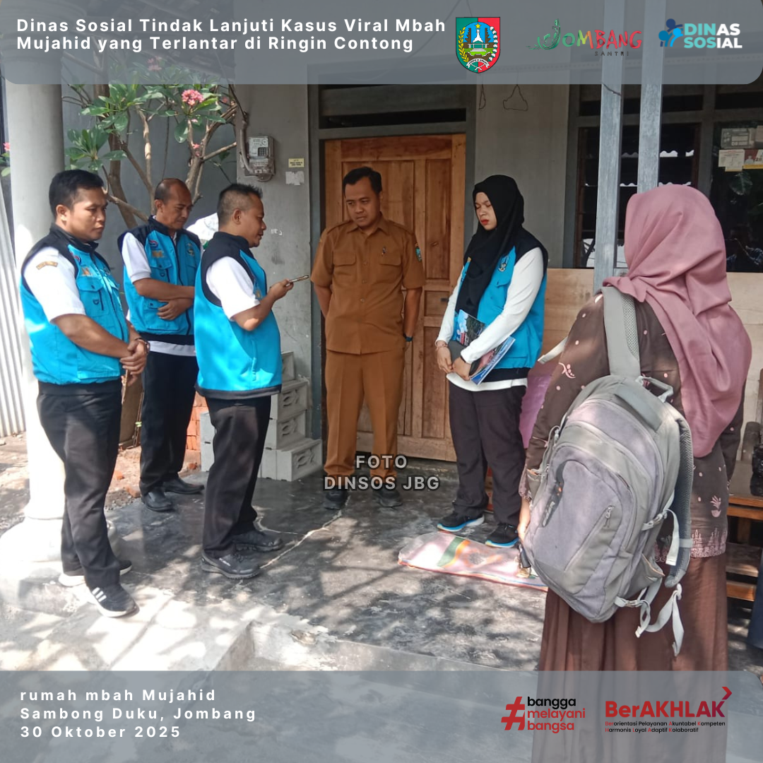 Dinas Sosial Kabupaten Jombang bersama SDM PKH dan Panti Sosial Tresna Werdha (PSTW) Jombang menindaklanjuti kasus viral seorang lansia bernama Mbah Mujahid yang sempat terlantar di area Ringin Contong, Jombang.