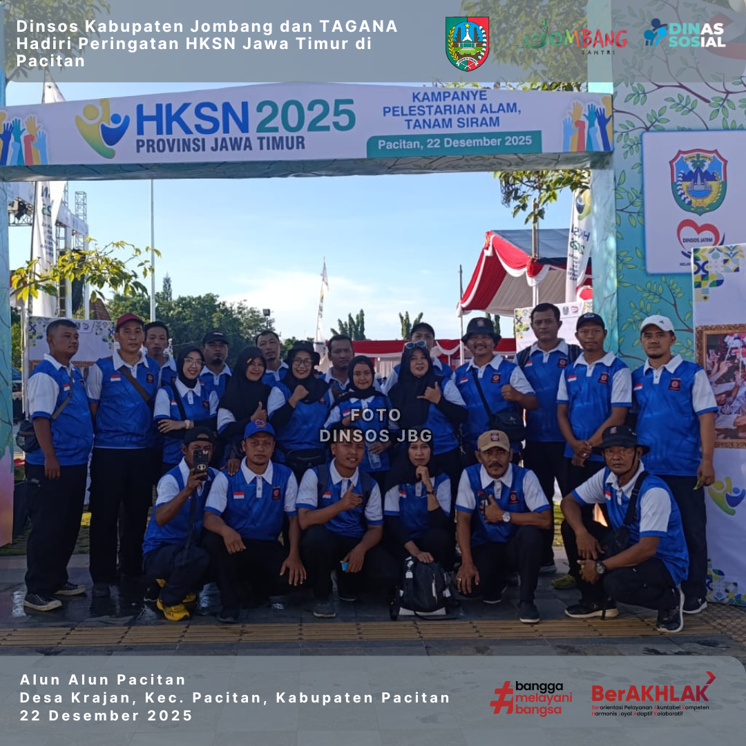 Dinas Sosial Kabupaten Jombang bersama Taruna Siaga Bencana (TAGANA) Kabupaten Jombang menghadiri undangan peringatan Hari Kesetiakawanan Sosial Nasional (HKSN) tingkat Provinsi Jawa Timur yang digelar di Alun-Alun Kabupaten Pacitan pada Jumat, 22 November 2025.