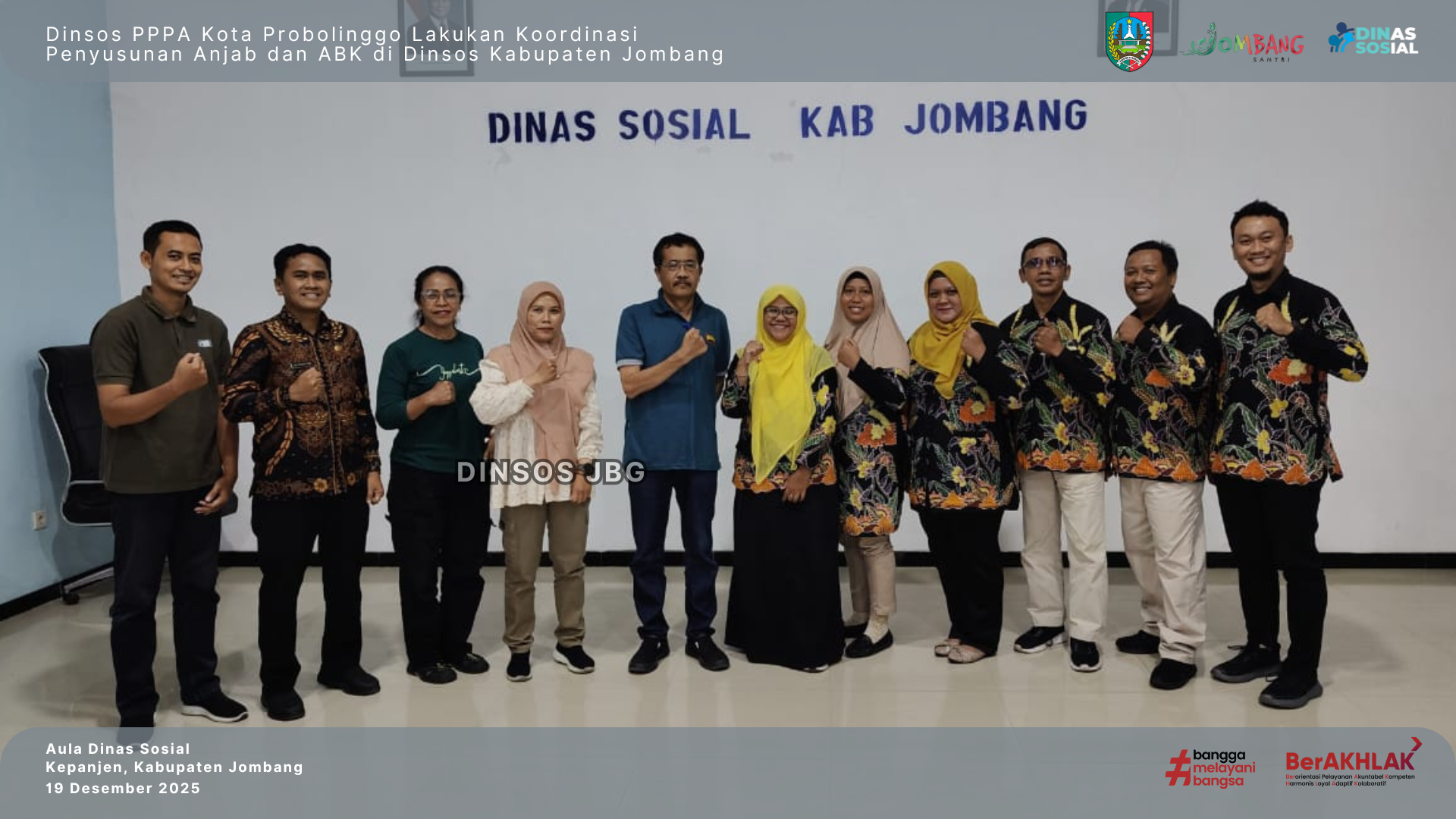Kegiatan koordinasi tersebut dilaksanakan pada Jumat, 19 Desember 2025, bertempat di Aula Pertemuan Dinas Sosial Kabupaten Jombang. Koordinasi ini bertujuan untuk saling berbagi informasi dan pengalaman dalam penyusunan Anjab dan ABK, khususnya untuk jabatan fungsional di bidang kesejahteraan sosial.