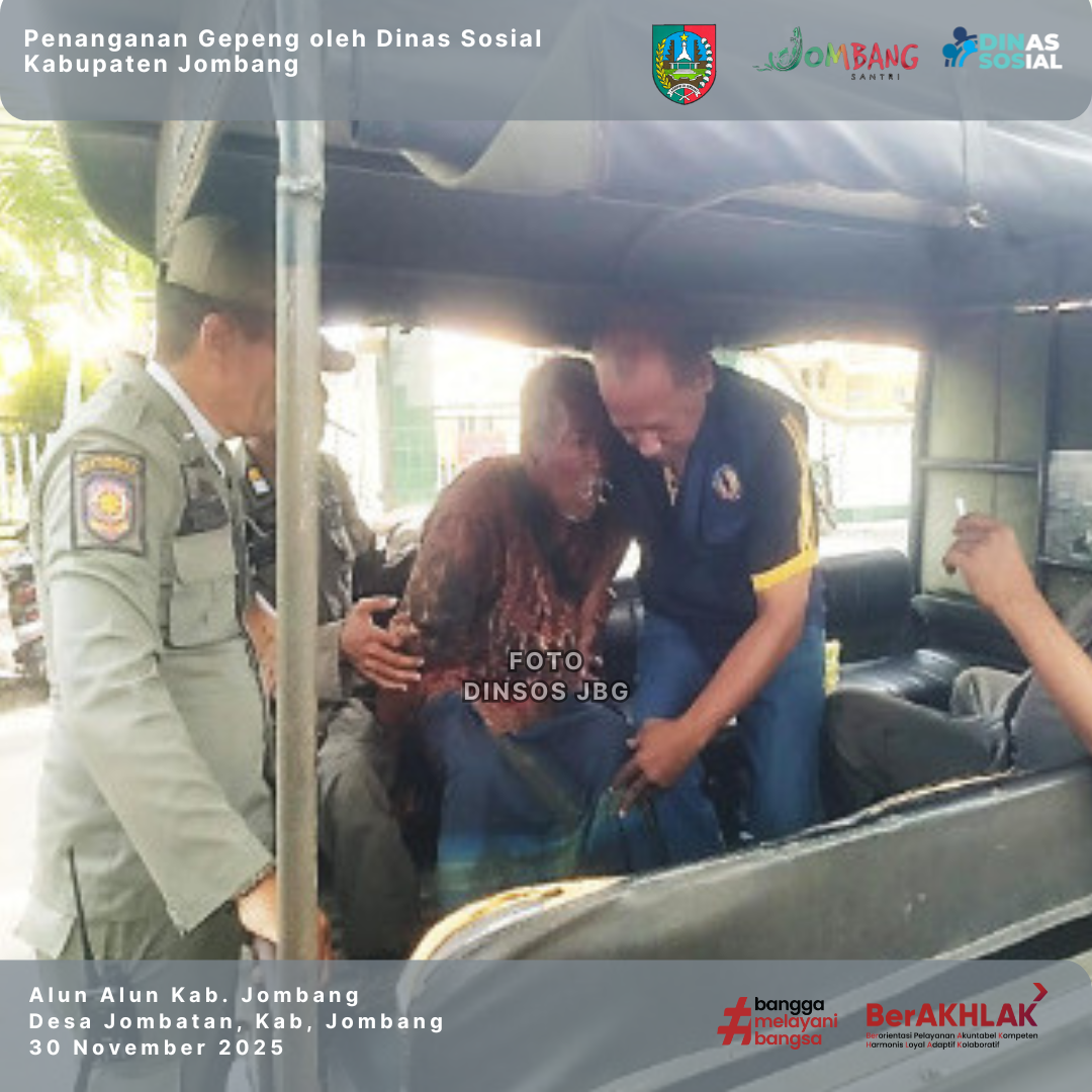 Dinas Sosial Kabupaten Jombang merespons laporan penangkapan gelandangan dan pengemis (gepeng) oleh Satpol PP setelah menerima informasi adanya seorang lansia terlantar yang beraktivitas tidak wajar di area publik. Lansia tersebut diketahui sering berbaring dan tidur di sekitar jogging track Alun-Alun Jombang. 30 November 2025