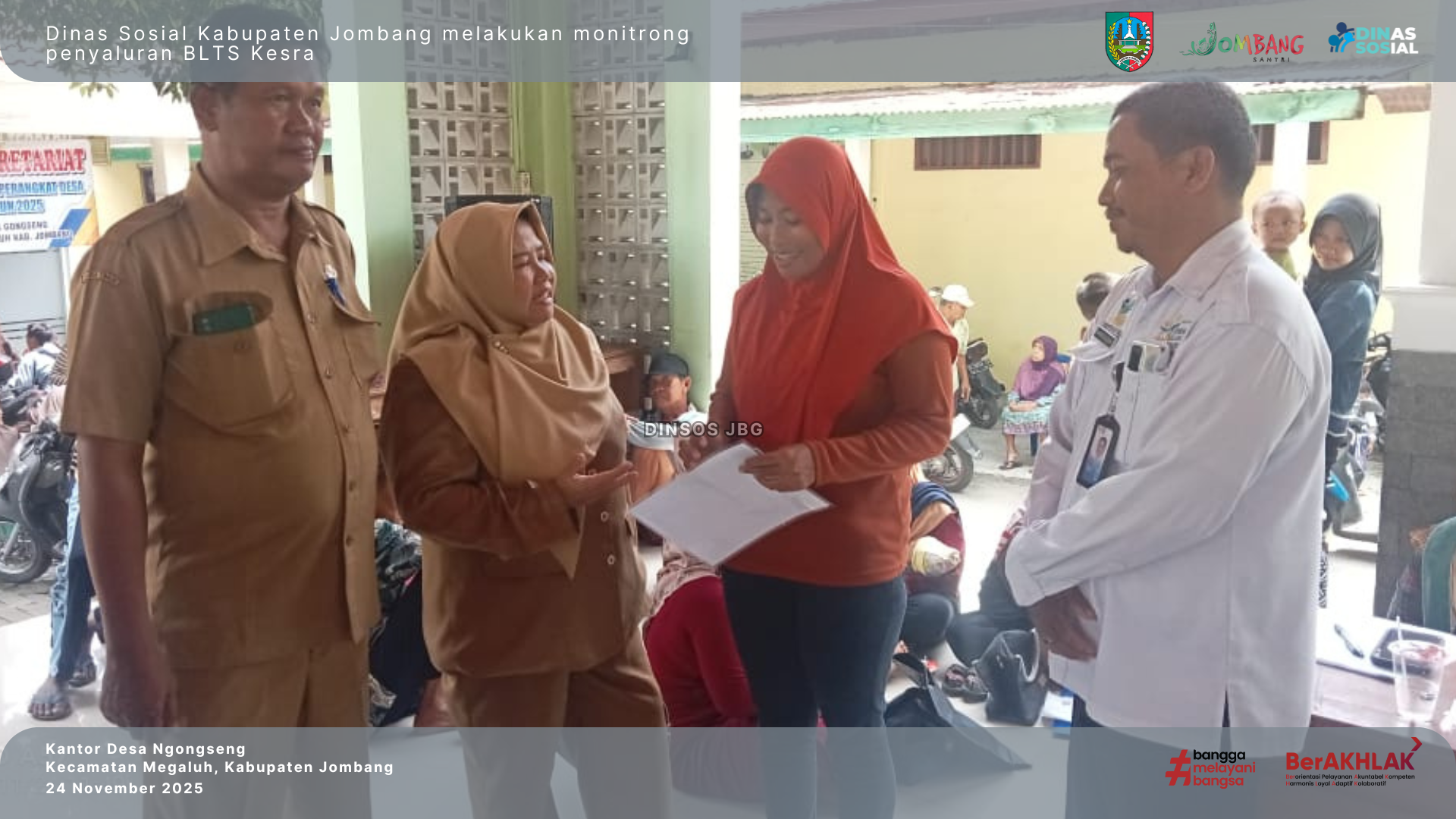 Dinas Sosial Kabupaten Jombang melaksanakan monitoring penyaluran Bantuan Langsung Tunai Subsidi Kesejahteraan Sosial (BLTS Kesra) yang diberikan kepada masyarakat penerima manfaat di seluruh wilayah Kabupaten Jombang. Bantuan ini diberikan kepada 58.373 penerima manfaat dengan besaran Rp900.000 per orang, yang tersebar di 21 kecamatan.